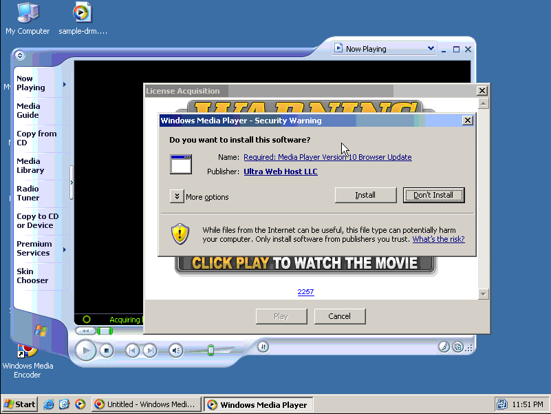 The process exploited a feature of the Media Player content protection, which allows protected files to pop up a Web page with information about a video or song license. In such a case, that page could be loaded with automatic spyware download mechanisms, Spanish security company Panda Software said.